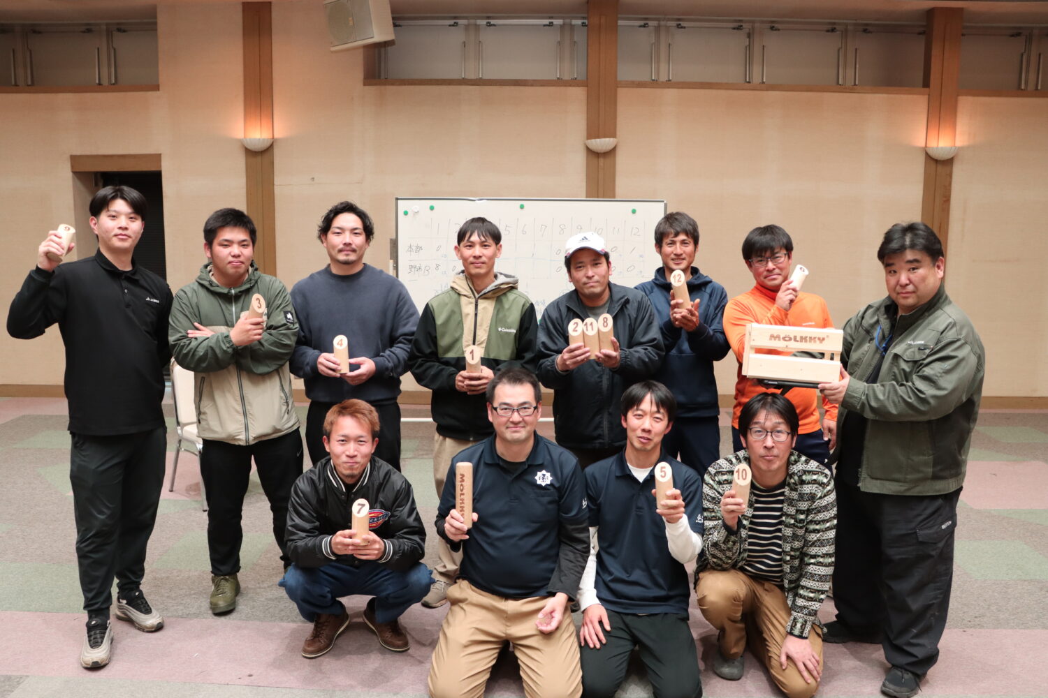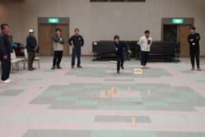 モルックで部員同士の親睦を深める 青壮年部土佐香美本部は、部員同士の親睦を深めることを目的に、野市支所2階大ホールで親睦会を開催。部員11人が参加しました。 今回は、木製の棒を投げて数字の書かれたピンを倒し得点を競う、フィンランド発祥のニュースポーツ「モルック」を実施しました。 参加者の多くが初挑戦でしたが、年齢や経験を問わず楽しめる競技ということもあり、次第に打ち解け、会場は和気あいあいとした雰囲気に包まれました。部員からは第2回開催を望む声も上がり、今後の継続開催にも意欲を見せていました。