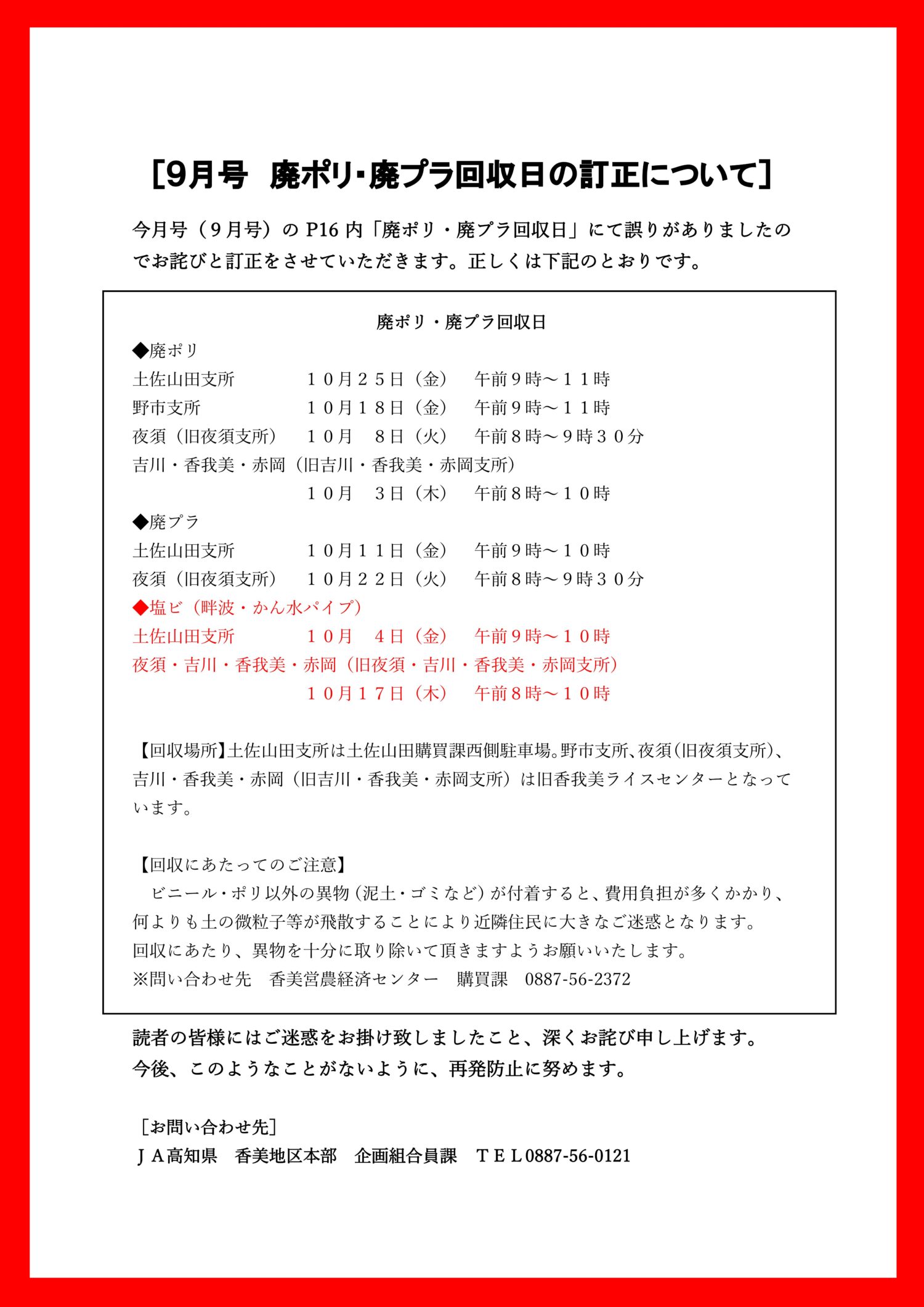 こうぐり9月号 廃ポリ・廃プラ回収日の訂正について こうぐり9月号のP16内「廃ポリ・廃プラ回収日」にて誤りがありましたので訂正してお詫び申し上げます。 今後、このようなことがないように、再発防止に努めます。