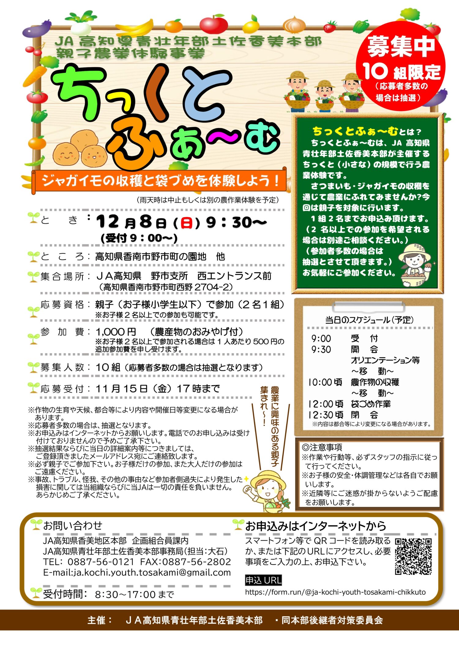 ジャガイモの収穫と袋づめを体験してみませんか🥔 青壮年部土佐香美本部が開催する親子農業体験事業「ちっくとふぁーむ」が今年も募集を開始しました!! 今年はジャガイモの収穫と袋づめの体験を、親子を対象に10組限定で開催します!農業に興味のある親子はぜひご応募ください 🥔 詳しくは下記画像をご確認ください! お申し込みはこちらから→https://form.run/@ja-kochi-youth-tosakami-chikkuto