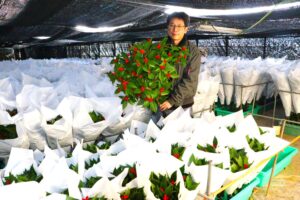 70㌃で栽培する細松卓也さんは、「最初は目立つ場所において、時間が経ったら直射日光に当たらない場所に置くと2月まで長持ちする。縁起の良いセンリョウを飾って良いお正月を迎えてもらいたい」と意気込んでいます🌸