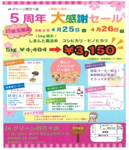 JAグリーン四万十店 感謝祭 JAグリーン四万十店 移転OPEN5周年 大感謝セーーーール🌸! 感謝をこめて・・・・💖 しまんと農法米大特価! こんなに種類があるの⁉たくさん仕入れます!ポン酢コーナー🍊試飲あり 詰め放題のイベント、キッチンカーも来るよ🚙 みなさんのお越しをお待ちしております!