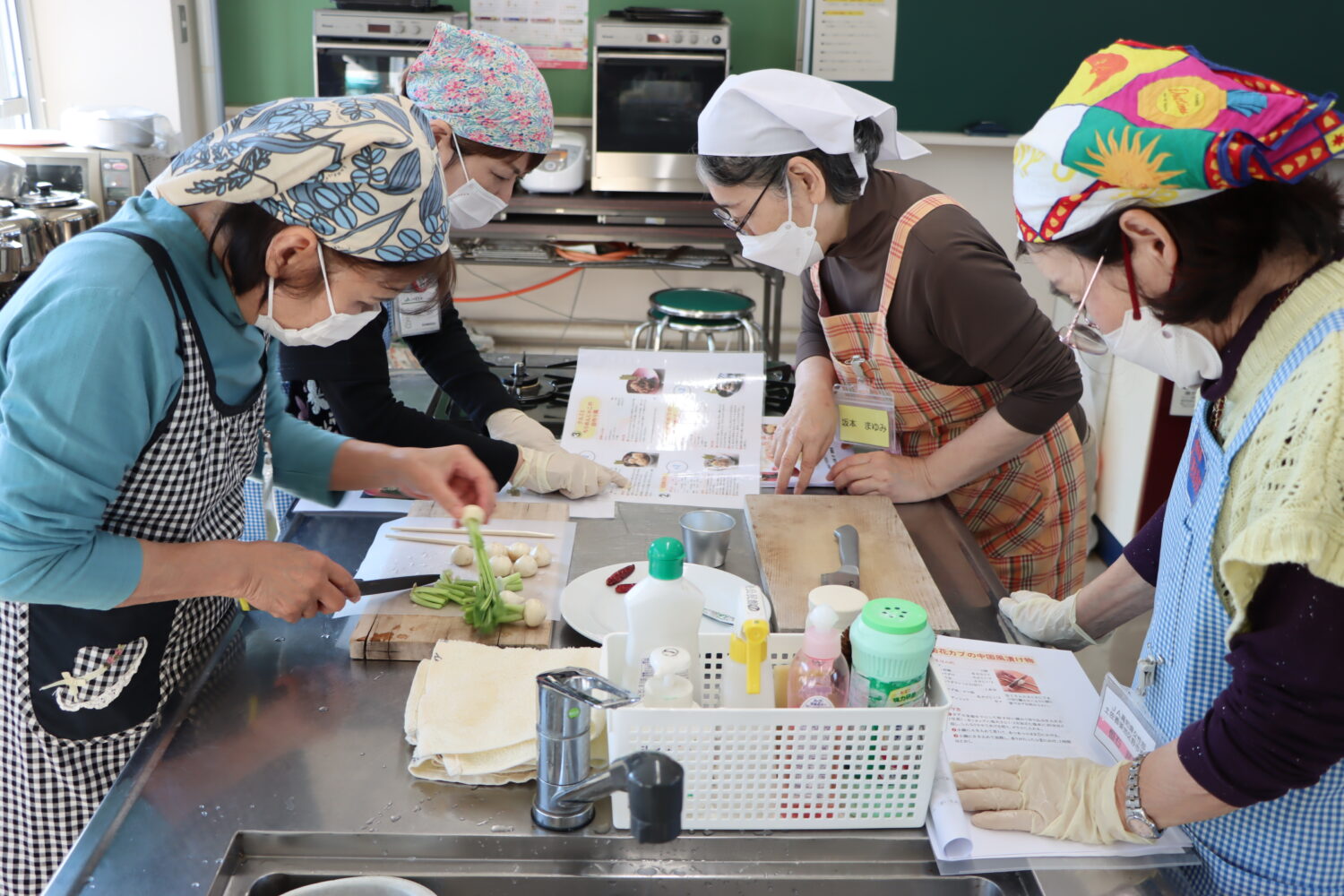 参加者は女性部員から調理のポイントを学び、「味はこれでいいかな?」「盛り付ける器も大事やね。おしゃれに見える」など交流をしながらいつもと違った味付けのおせち料理作りを楽しみました!!