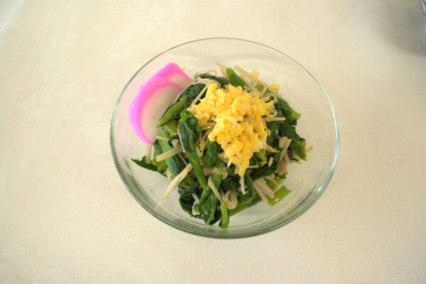 ナバナのおひたし 5人分 なばな 材料 ・ナバナ・・・・・・250g ・エノキダケ・・・・1袋 ・卵・・・・・・・・1個 A 砂糖・・・・大さじ1 醤油・・・・大さじ1 ・白ごま・・・・・・適量 作り方 ①一口大に切ったナバナとエノキダケをさっと茹でる。 ②卵をそぼろ状に焼き、粗熱を取っておく。 ③①にAを混ぜる。 ④白ごまを入れて全体を混ぜ、②を載せて出来上がり。 ポイント 細く切って軽く茹でたニンジンを入れると、彩り良くできます。