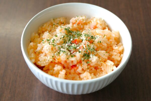 ④炊き上がったら、しゃもじでトマトをつぶすようにして全体をざっくりと混ぜ合わせる。器に盛り、粉チーズと刻みパセリを振って完成。