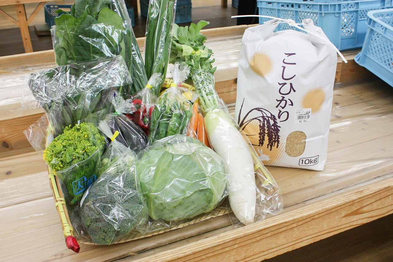 かざぐるま市はJA女性部が運営しており、生産者は全員女性部員です。そのため、女性ならではの細やかな気配りで育てられた、旬の野菜や果物、花、加工品などが魅力! 店舗には加工所も併設しており、手作り弁当やお寿司、惣菜なども人気です。