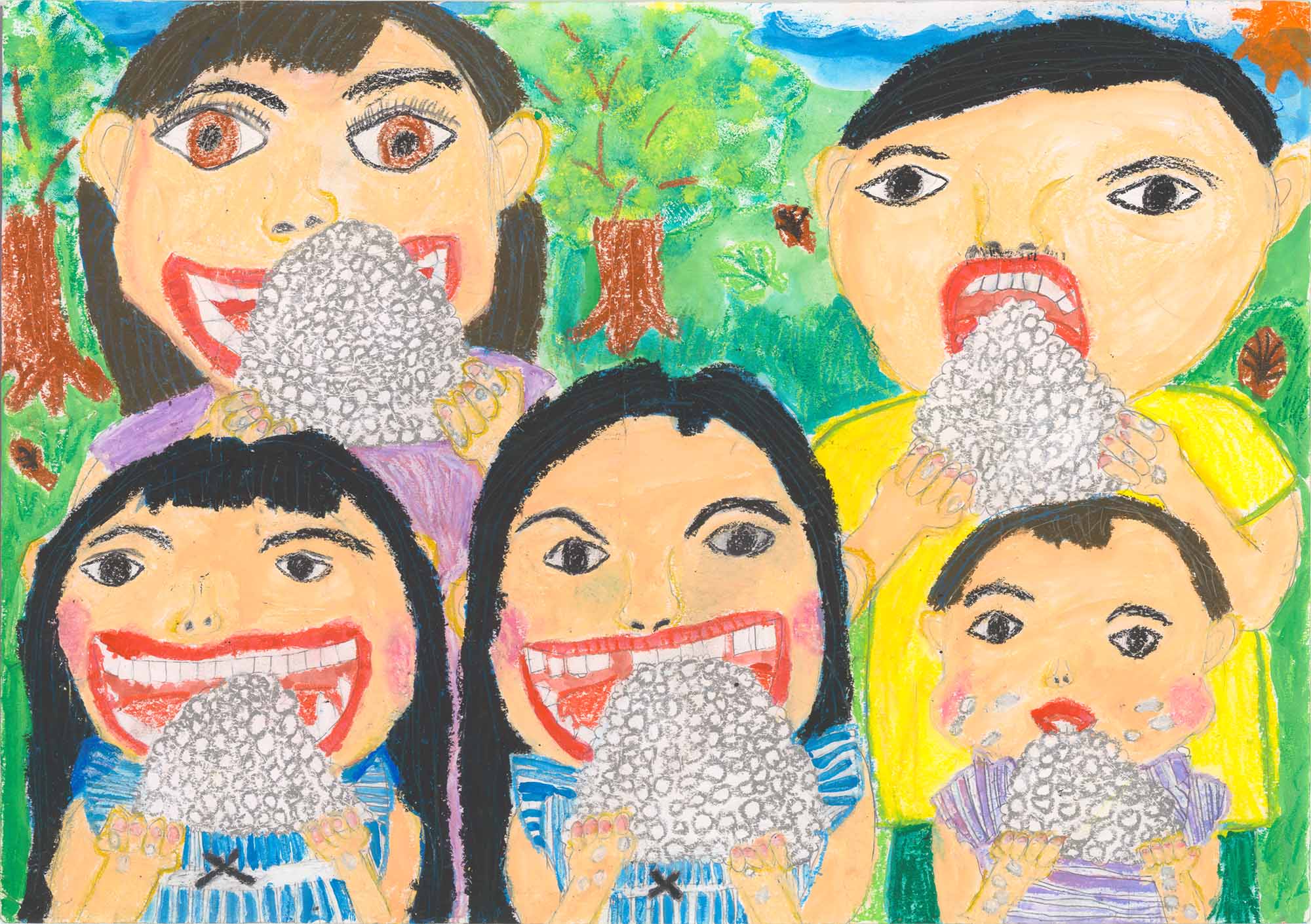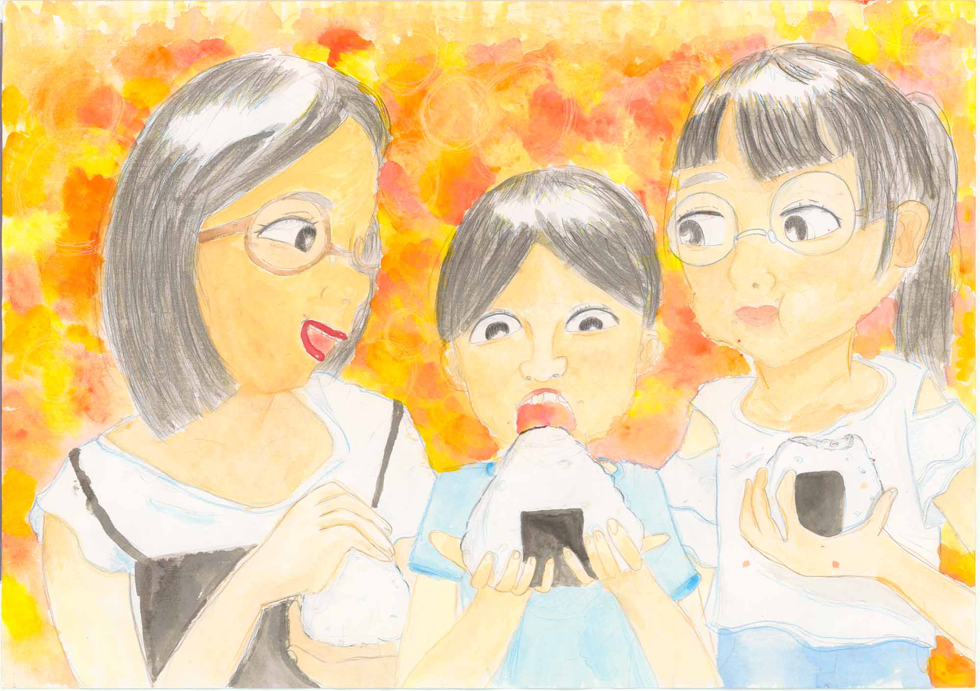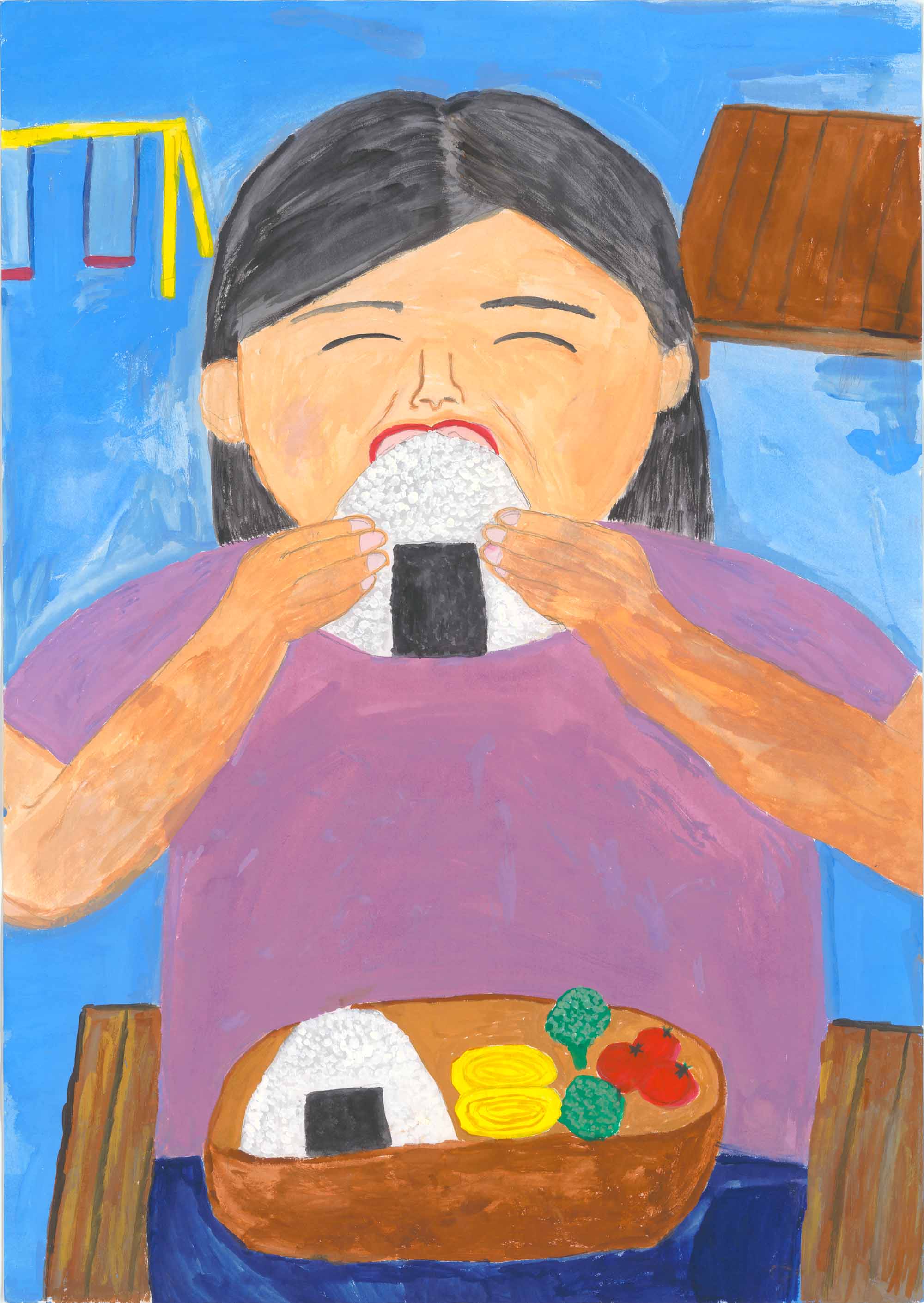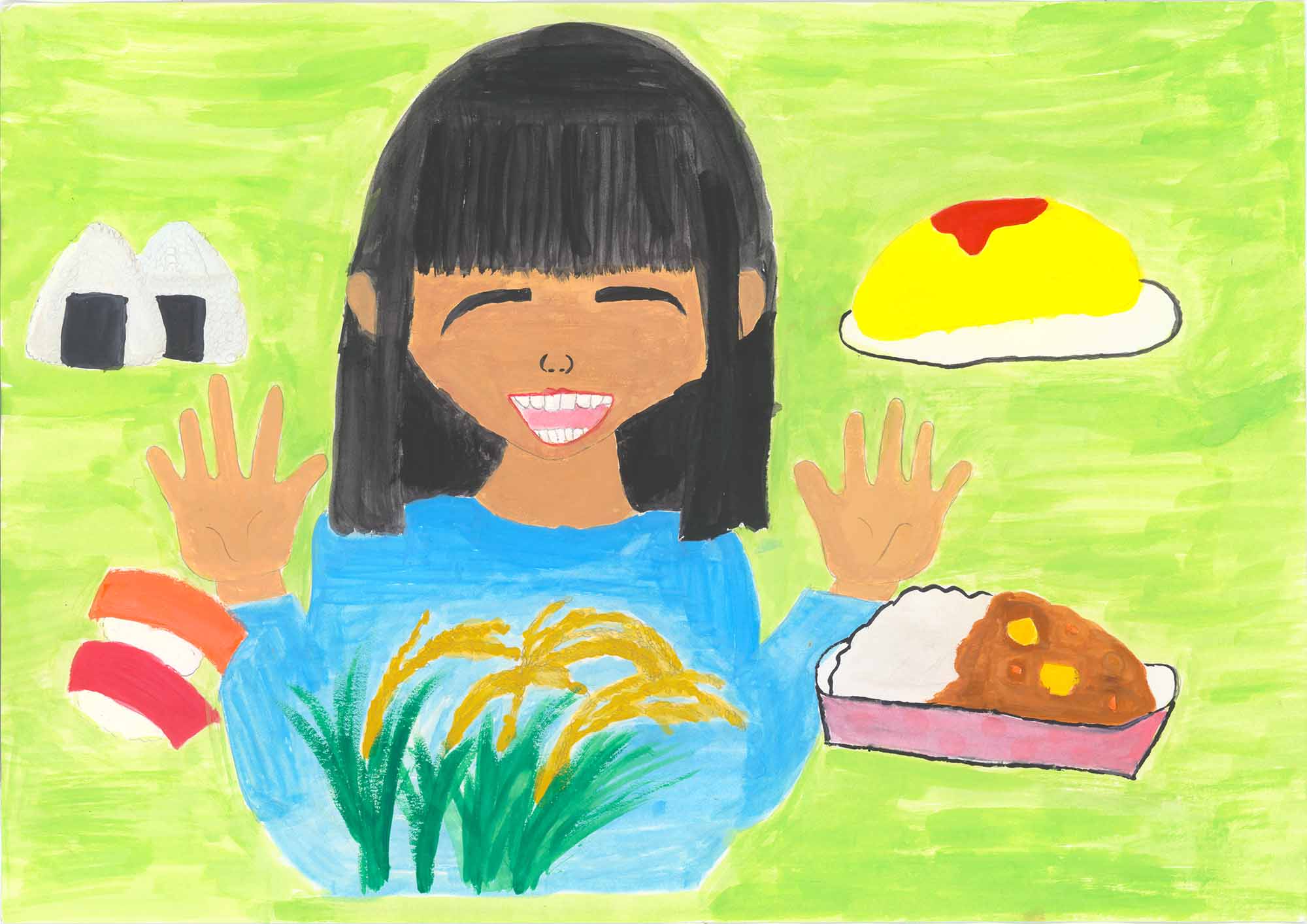 山岡審査員…遊園地でしょうか、屋外で大きなおにぎりにかぶりついている様子を画面いっぱいに描いています。お昼のお弁当を広げて大好きなおにぎりを食べている楽しい思いが伝わってくる作品です。