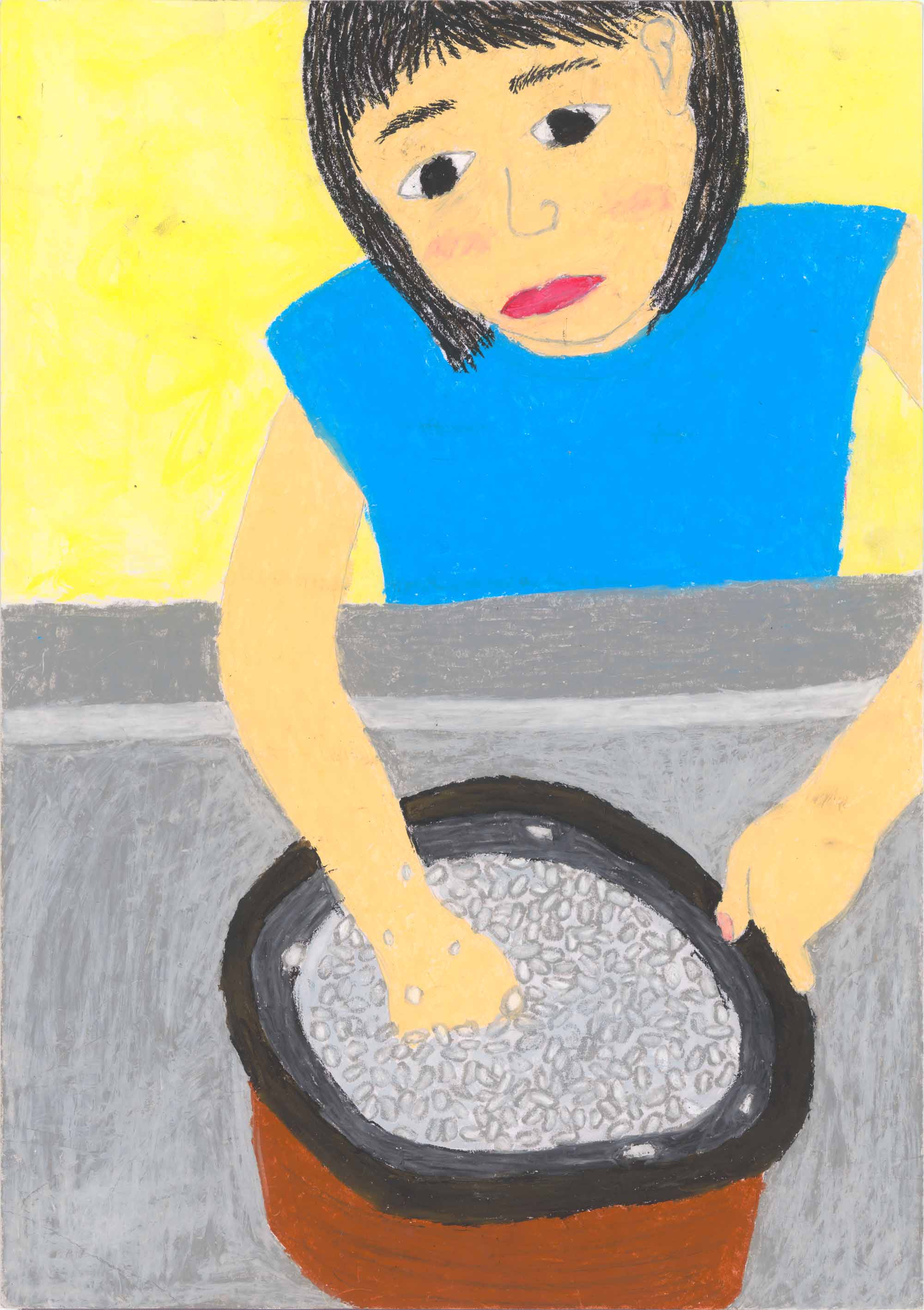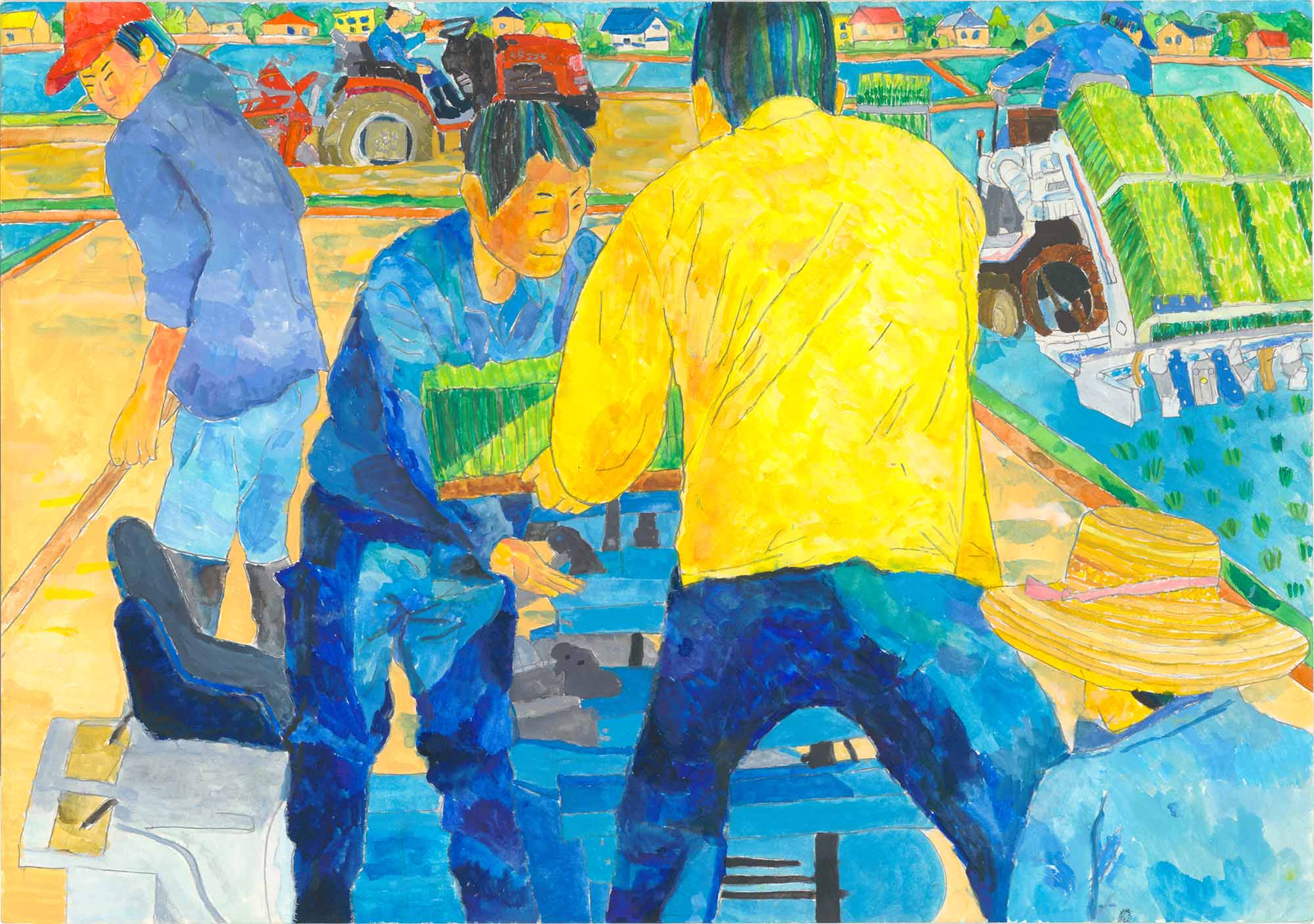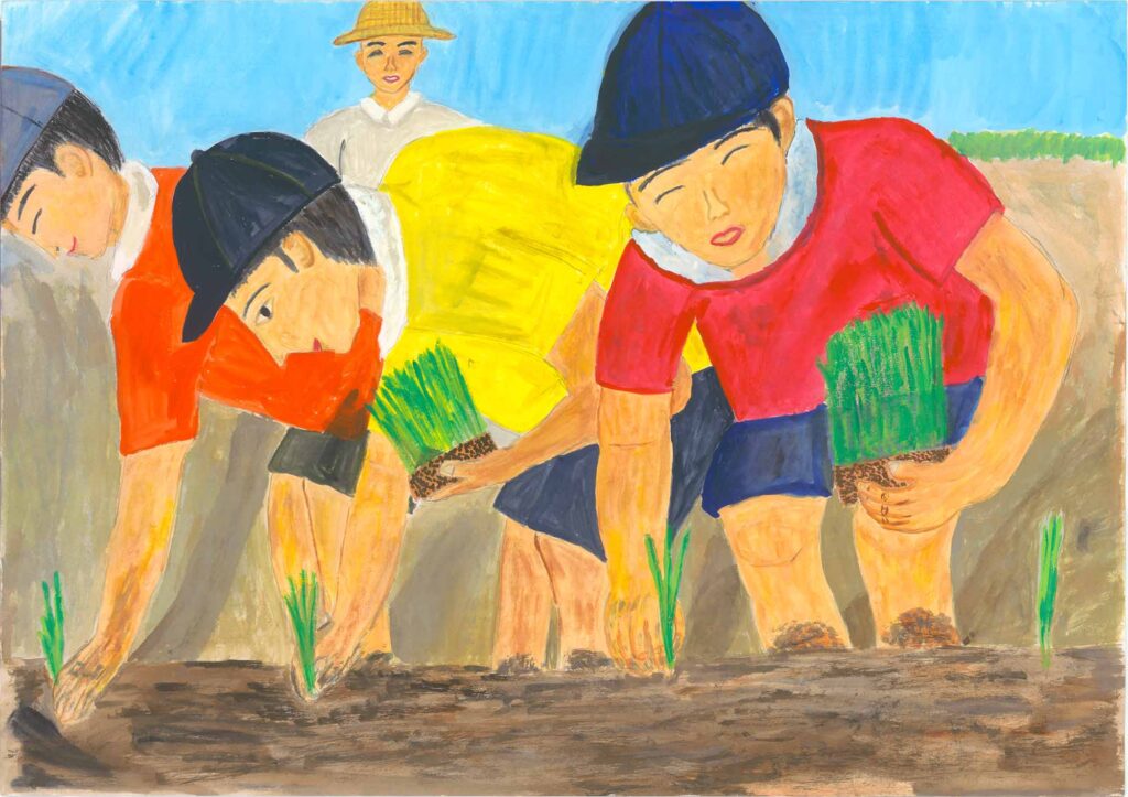 山岡審査員…田植えの様子を6年生らしい遠近感のある構図で描ききりました。人物の体の動きの表現力に優れています。特に着衣の色の変化が巧みで、青と黄色の対比する強い色使いが力強い絵に仕上がっています。遠景のトラクターや田植え機、建物なども丁寧にしっかり描けています。