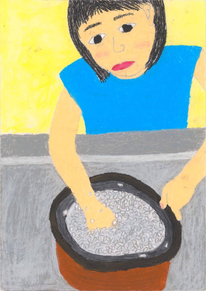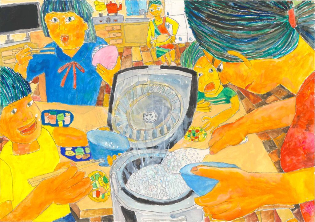 山岡審査員…食卓を囲んで、炊きたてのごはんをおかわりしている場面を描きました。ごはんの入った炊飯器を中心に置き、手前にごはんをよそっている人物の一部を大きく描き、後ろに食卓を囲んでいる様子を描いた、構図のよさが光っています。細かいところを丁寧に描いた表現力の確かさが感じられます。