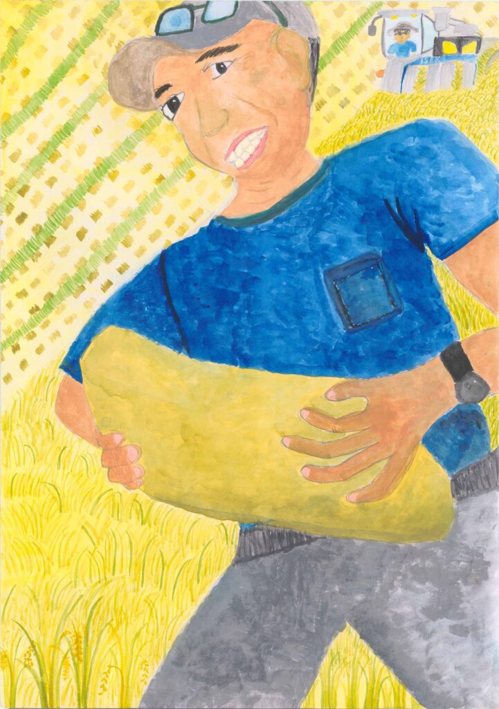 山岡審査員…画面いっぱいに新米を収穫するおじいちゃんの姿を描いています。画面からはみ出るほどに斜めに人物を入れることで力強い画面構成となっています。表現力が確かで、丁寧な着色や色彩の変化も上手に描かれており、収穫の喜びがよく表わされています。