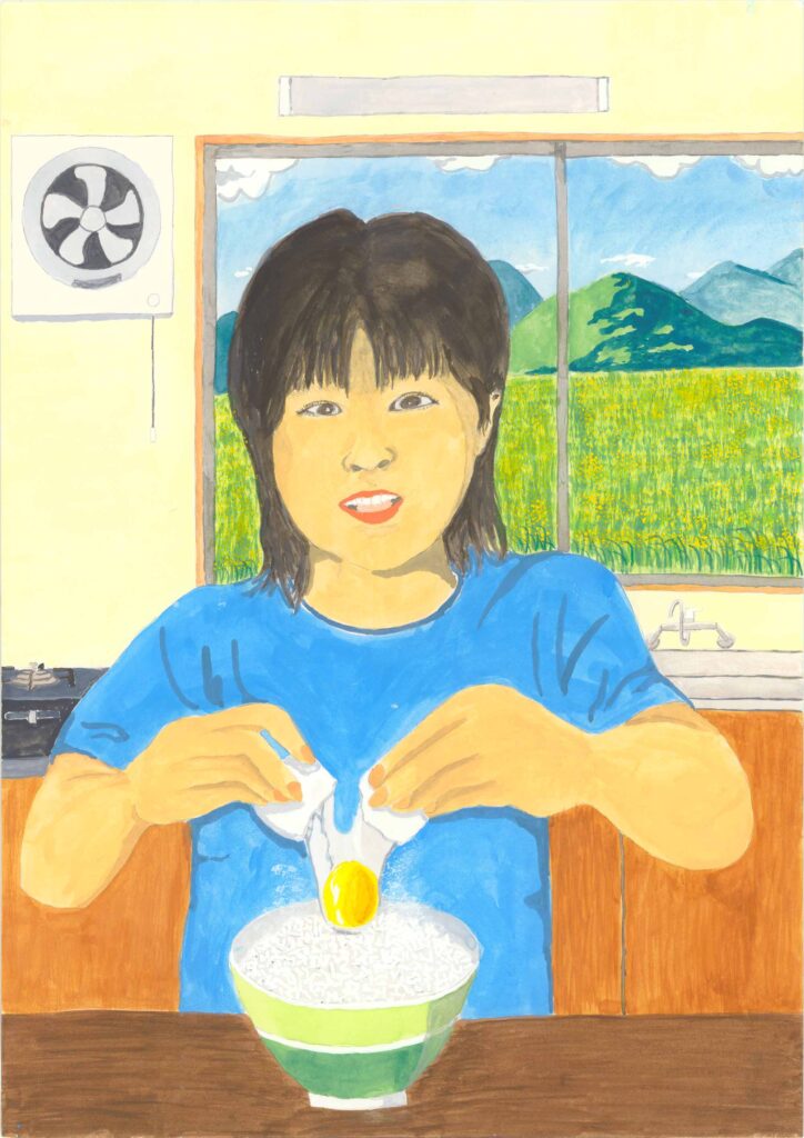 山岡審査員…朝食の卵かけごはんの様子を中学生らしい描写力で仕上げました。卵のヌルっとした質感がとてもよく出ています。人物の表現も自然で、色彩感覚のよさが画面に表れており、朝の透き通った空気感が背景の風景からも感じられます。