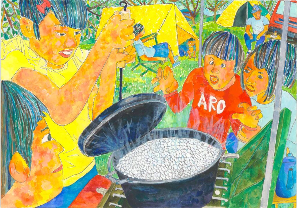 山岡審査員…キャンプで自分たちで炊いたごはんが出来た時の喜びが、女の子の表情や画面全体から感じられる絵に仕上がっています。緩やかな色の変化や、混色による色合いの工夫により場面の雰囲気が醸し出されて迫力のある絵に仕上がっています。