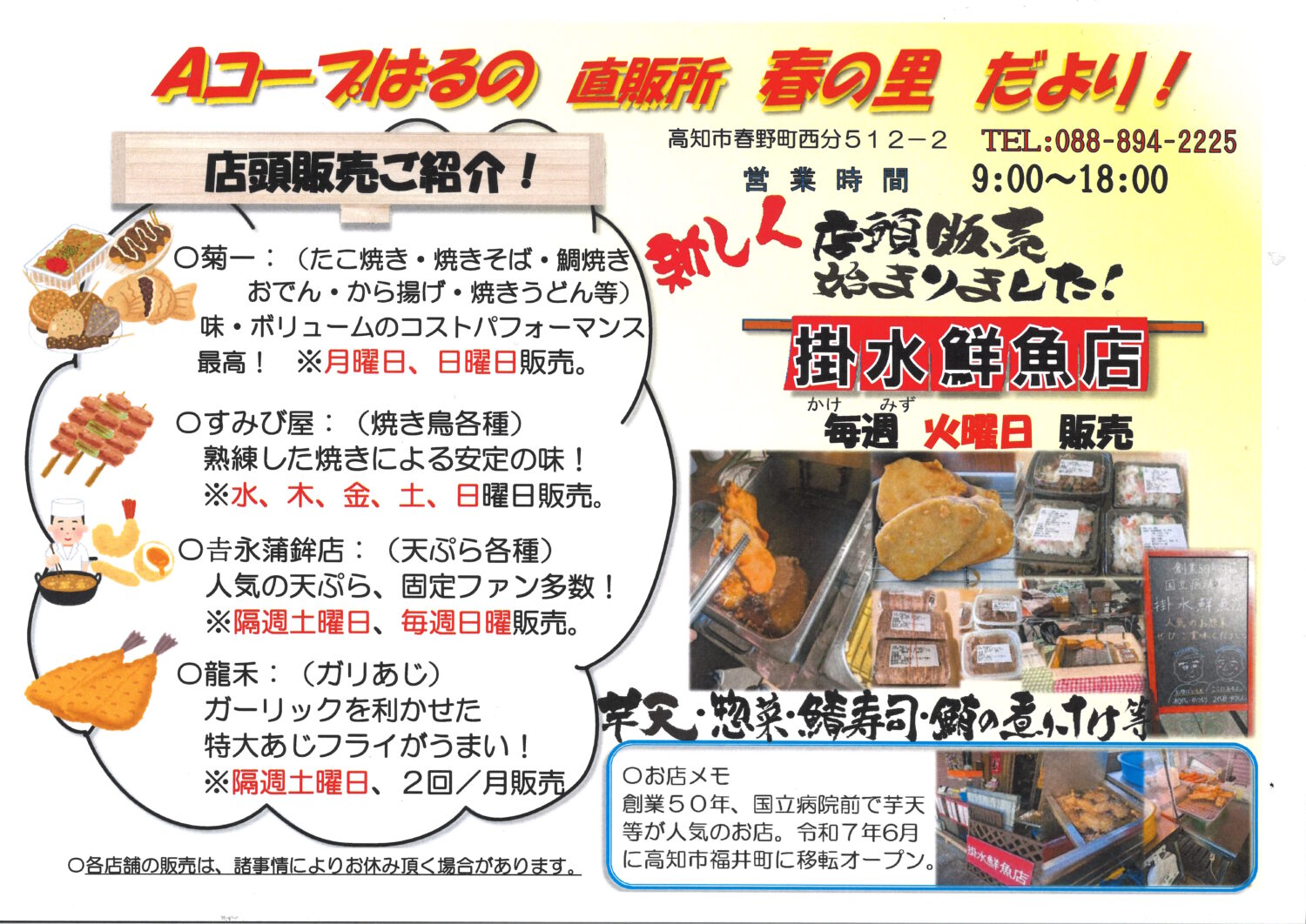 そして新しく店頭販売に芋天、惣菜、鯖寿司などを販売している『掛水鮮魚店』が仲間入りしました!